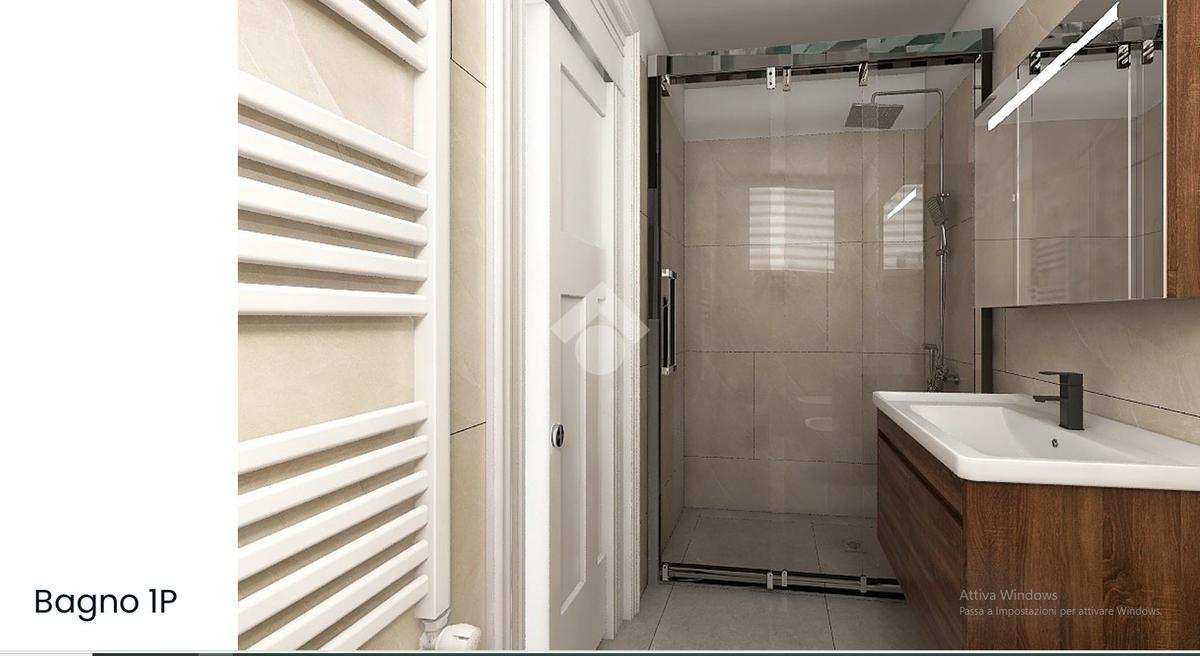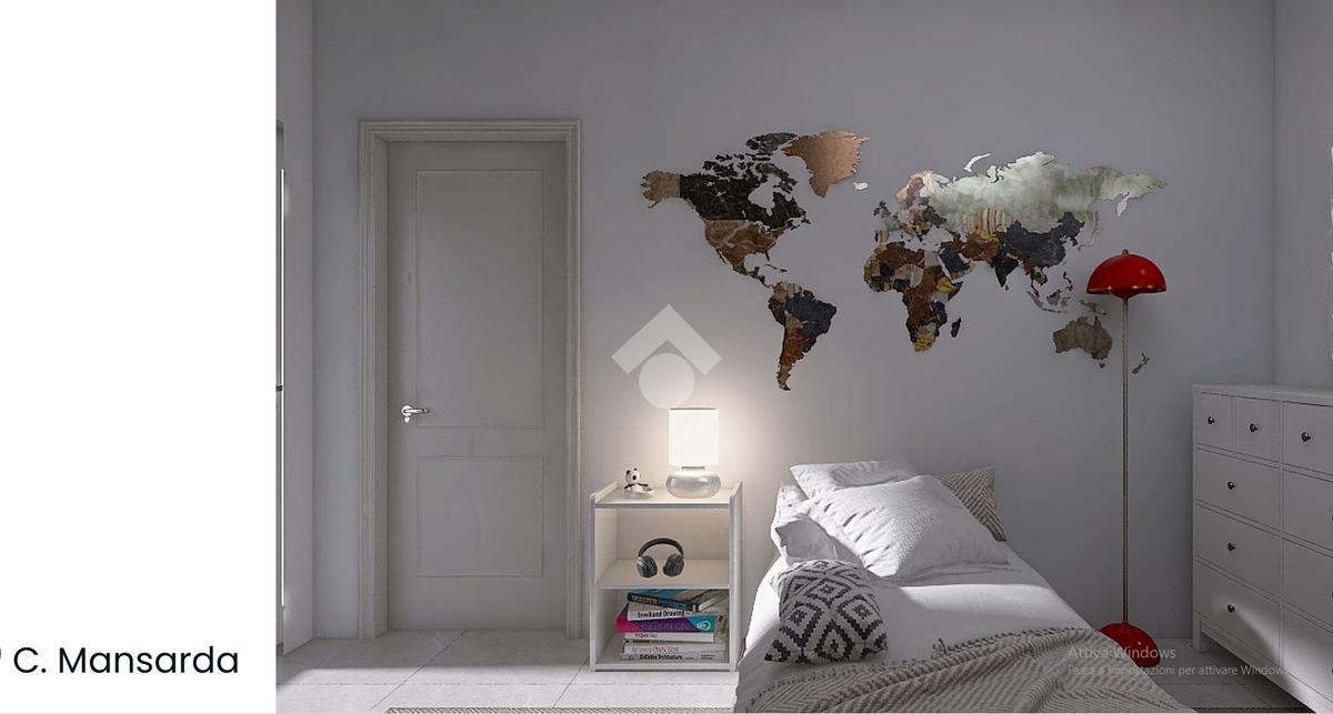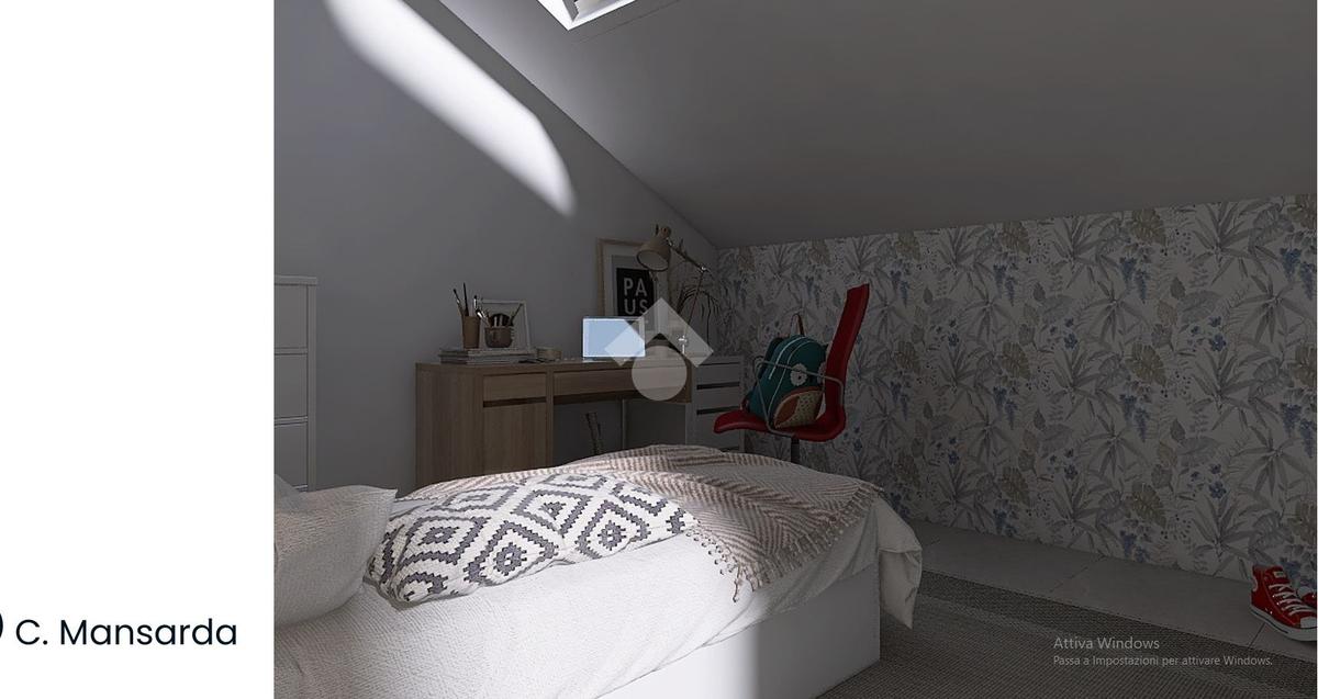 Al primo piano mansardato abitabile abbiamo una grande camera con accesso al balcone, una cabina armadio e un bagno con doccia finestrato;